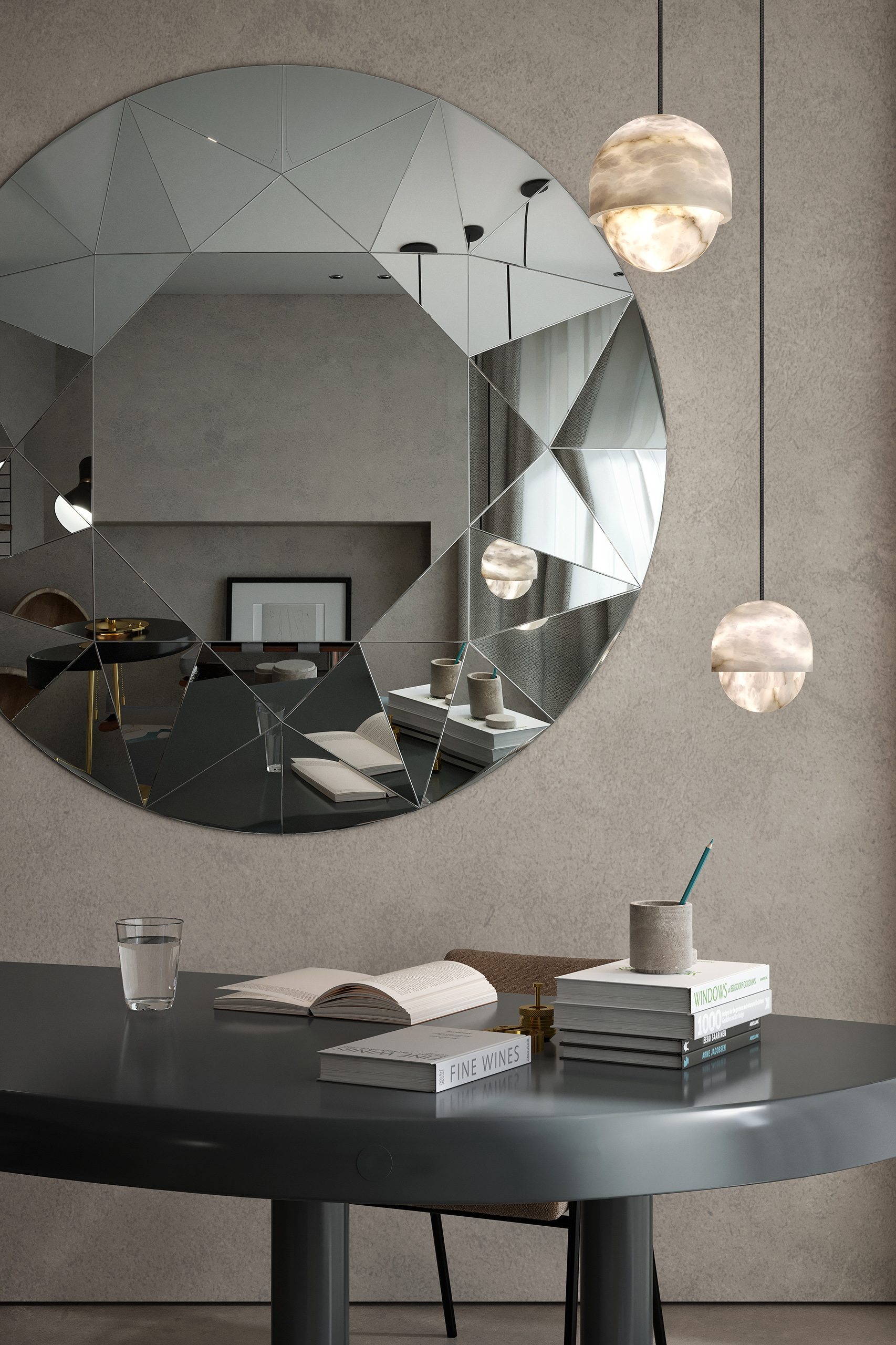Translucent natural alabaster spheres suspended from black cable, casting a warm, pearlescent glow. Alain Ellouz Paris commissioned us to photograph the Yoko collection, featuring two pendant lights positioned in front of a faceted mirror, the stone and its reflection.