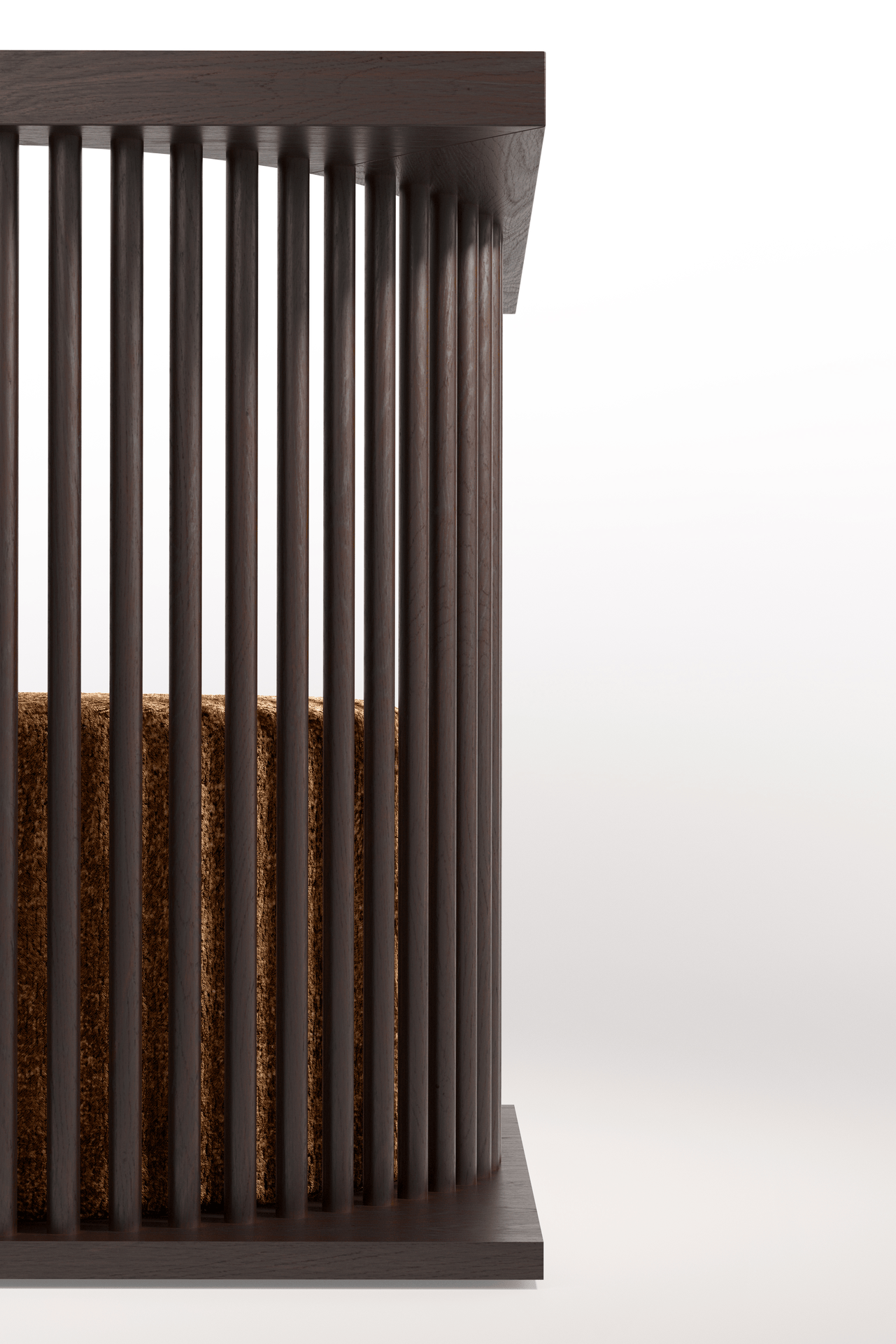 Chêne teinté sombre, piètement à trois arcades, barreaux incurvés, assemblage arrondi soigné. L'Atelier PA nous a confié la mise en image de la table Écrin, une pièce dont la structure sculpturale se révèle dans le détail autant que dans l'ensemble.